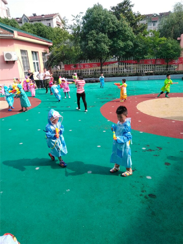 藻江园部中班的孩子们一个个手持水枪,群情振奋,和爸爸们玩起了“打水仗”的游戏。当一串串水柱喷射出来,身着五彩雨衣的孩子们在院子里奔跑着、躲闪着;当小朋友们身上越来越多地被来自四面八方的水柱淋湿以后,欢呼声、尖叫声、呐喊声,此起彼伏,幼儿园顿时沸腾起来,变成了欢乐的海洋。平时威严的爸爸,今天变成了孩子王,和孩子们一起都沉浸在玩水的乐趣中。
